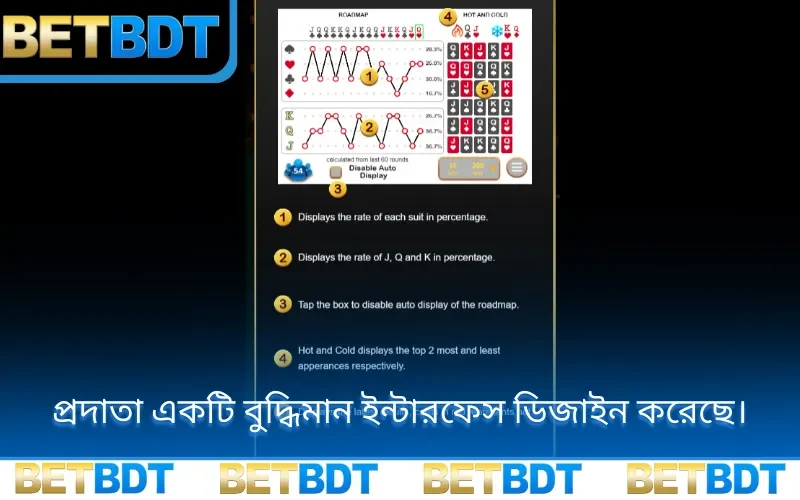 Poker Roulette এর ইন্টারফেস অত্যন্ত সহজবোধ্য। স্ক্রিনে ‘রোডম্যাপ’ দেখা যায় যা J, Q, K এবং চিহ্নগুলো আসার শতাংশ বা হার প্রদর্শন করে। প্রধান ফাংশনগুলো হলো:
