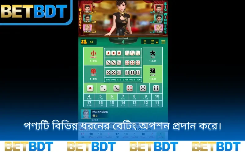 এই গেমটি বিভিন্ন ধরণের বাজির সুযোগ প্রদান করে যেমন- বিগ (Big), স্মল (Small), অড (Odd), ইভেন (Even), নির্দিষ্ট সংখ্যা, জোড়া সংখ্যা, ট্রিপল বা মোট পয়েন্ট। প্রতিটি রাউন্ড খুব দ্রুত সম্পন্ন হয়, যা বিনোদনের পাশাপাশি পেশাদারদের জন্য অর্থ উপার্জনের একটি চমৎকার মাধ্যম। আপনি যদি সঠিক চার্ট বিশ্লেষণ এবং মূলধন ব্যবস্থাপনা কৌশল প্রয়োগ করেন, তবে অবশ্যই বিশাল মুনাফা অর্জন সম্ভব।