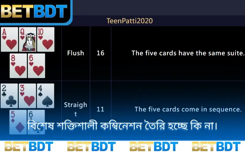 - Flush: Teen Patti 20-20 গেমে একই স্যুটের যেকোনো ৫টি কার্ড। পেমেন্ট ১:১৫।